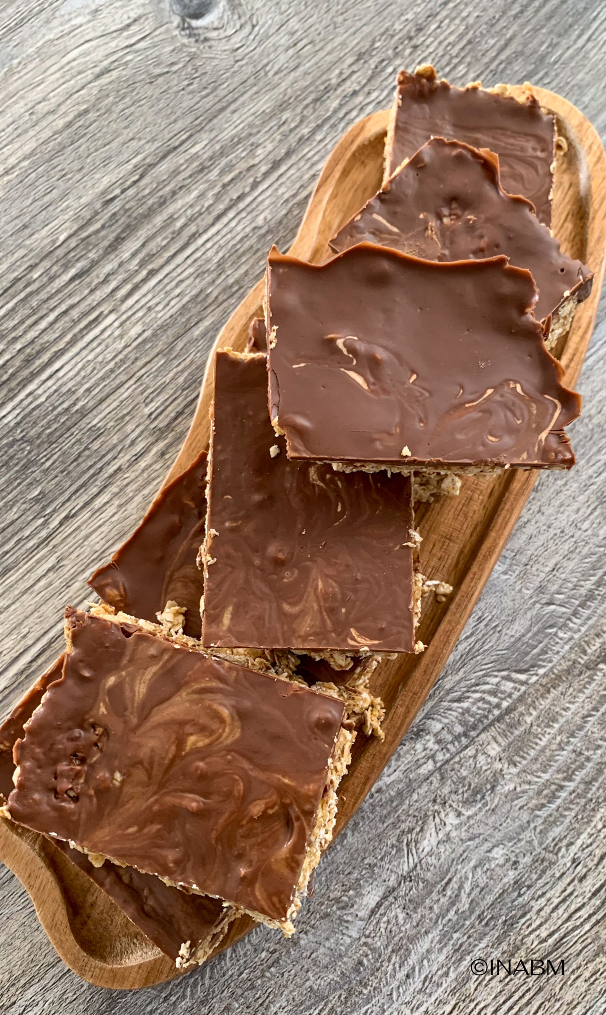 - Once toppings are ready, pour the chocolate over the oatmeal base and spread evenly. Then add the peanut butter over the chocolate layer and make swirls using a butter knife